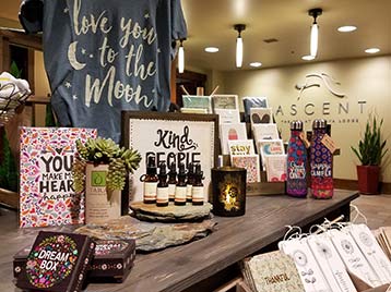 the spa on the lodge lower level, carries unique and fun gift items such as clothing, books, journals, wall art, workout clothing, accessories such as scarfs and